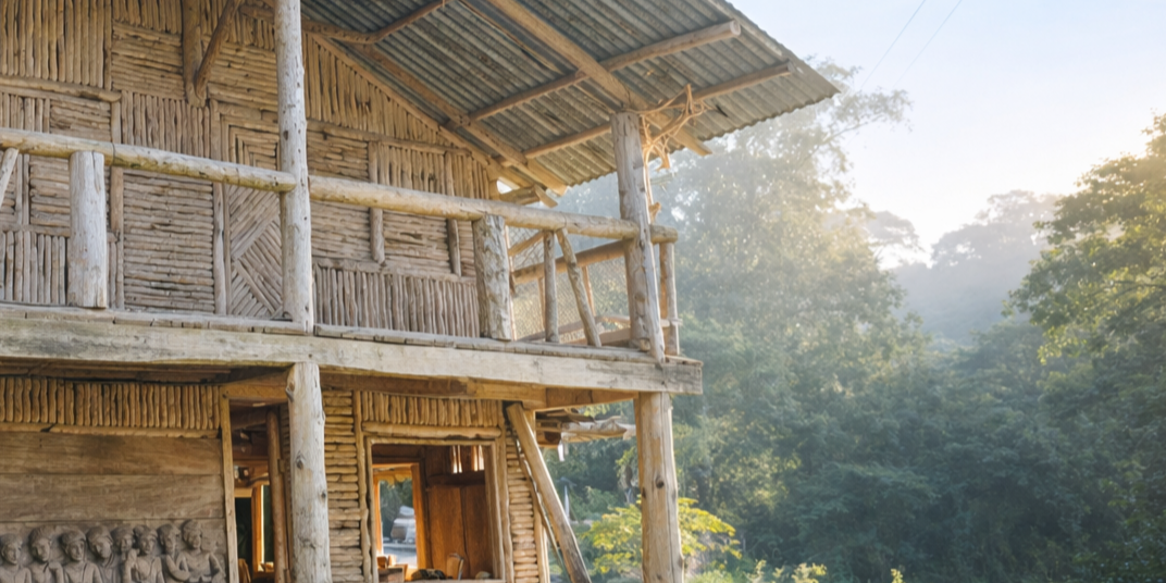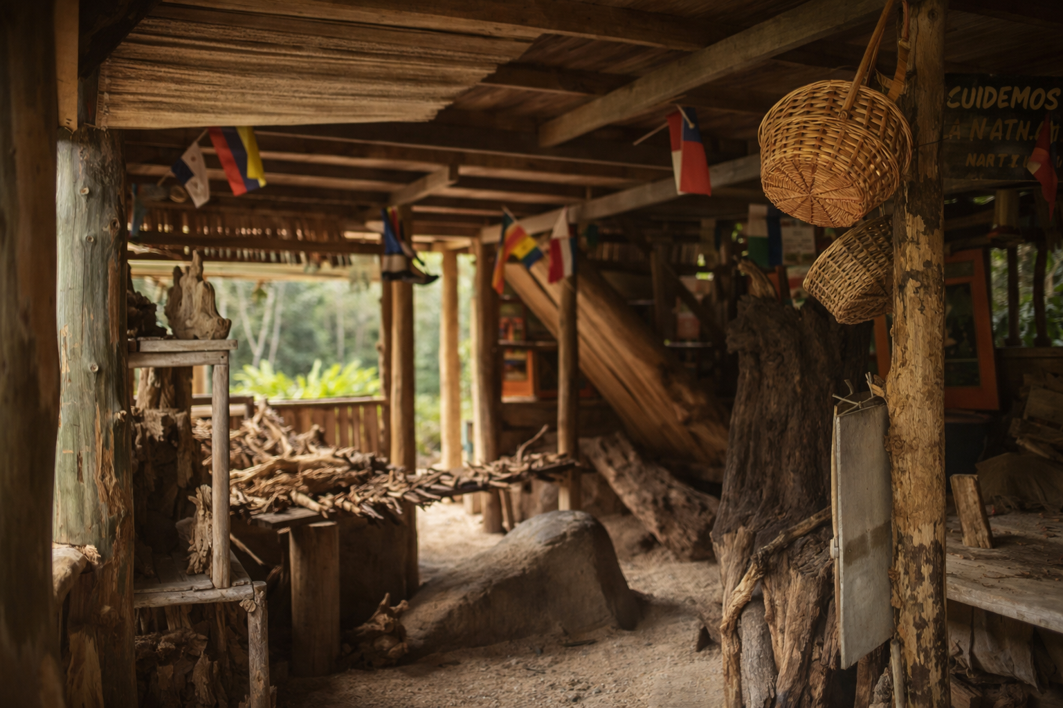 Entrar a la Casa del Soñador es entrar en un templo sencillo. La cabaña de troncos, construida por el propio artista, es una escultura en sí misma. La luz se filtra entre la madera, el olor a río cercano acompaña el recorrido y el silencio invita a escuchar.