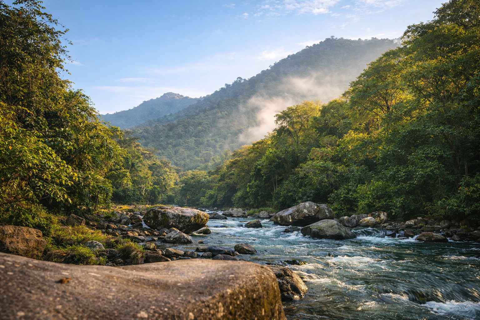 Algunos senderos permiten acercarte a miradores naturales donde la vista se abre hacia montañas cubiertas de bosque primario. Otros siguen el curso del río, permitiéndote caminar acompañado por el sonido constante del agua.